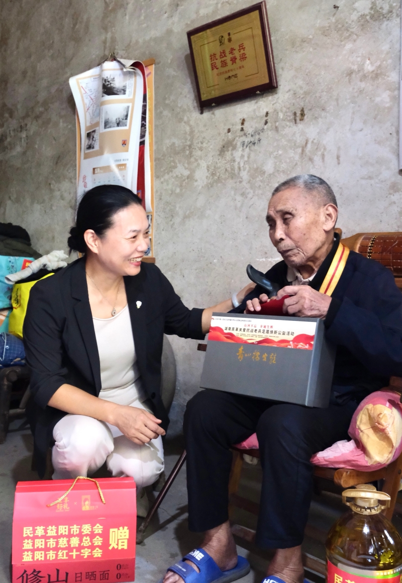 每到一处,志愿者们与老兵促膝长谈,认真倾听他们讲述抗战时期浴血奋战的峥嵘岁月。从烽火连天的战场记忆到保家卫国的坚定信念,老兵的讲述生动还原了那段艰苦卓绝的历史,让在场人员深受触动。杨茜主委为他们送上慰问物资和湖南民革关爱抗战老兵足履焕新公益活动的礼品,并在交流中表示,抗战老兵是民族英雄,他们的功绩与精神值得永远铭记。此次活动既是落实“铭记功勋·致敬老兵”主题活动的具体举措,更是希望通过面对面的关怀,让老兵感受到社会各界的温暖,同时引导更多人从历史中汲取力量,传承爱国情怀。益阳医专附属医院党委书记文向华也表示,将持续发挥医疗资源优势,为抗战老兵提供更多健康服务,以实际行动践行社会责任。