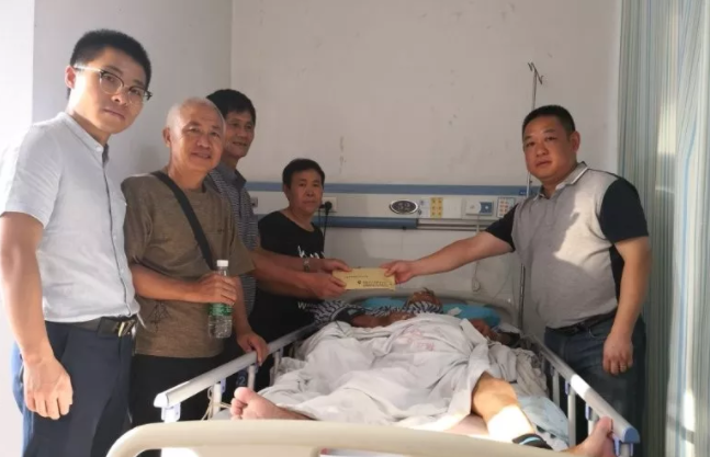92岁的抗战老兵邓梅开,无儿无女,前几天因在家中不慎摔倒,导致头部受伤,枕骨骨折,右颞骨乳突骨折,右侧乳突及外耳道内积液(血),颅内大量积气,外伤性蛛网膜下腔出血,在桃江县人民医院住院治疗,生命一度垂危。8月3日晚,在长沙参加学习的民革市委委员李科从志愿者处了解到邓梅开老人的情况,立即向民革市委专职副主委雷细珍汇报。得知老人病重的情况,雷细珍副主委因在外地无法及时赶赴桃江,特委托李科等民革志愿者到桃江看望老人。8月4日中午,李科学习结束立即赶赴桃江,病房中的邓梅开老人,由其侄儿、侄媳及爱心志愿者照顾,病情虽比前几日有所好转,但仍未脱离危险,也无法交流。李科等代表民革市委为老人送上5000元慰问金和水果等物资,祝愿老人早日康复。
